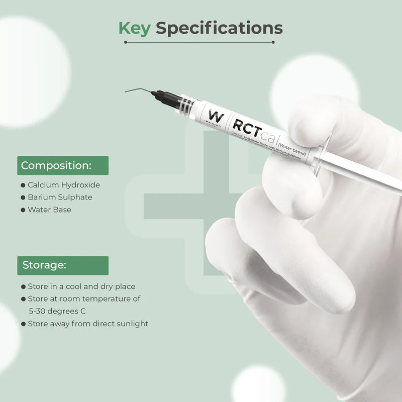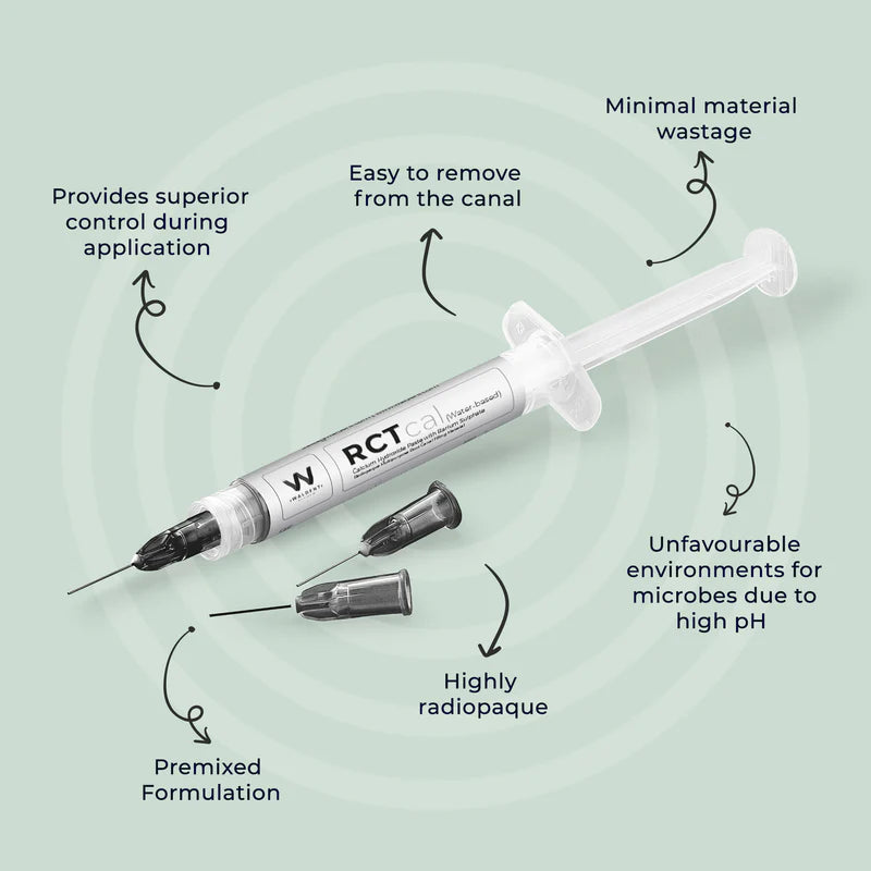 Waldent RCTcal is a water-based paste indicated for temporary root canal dressing, pulp capping, vital pulpotomy, and apexification.