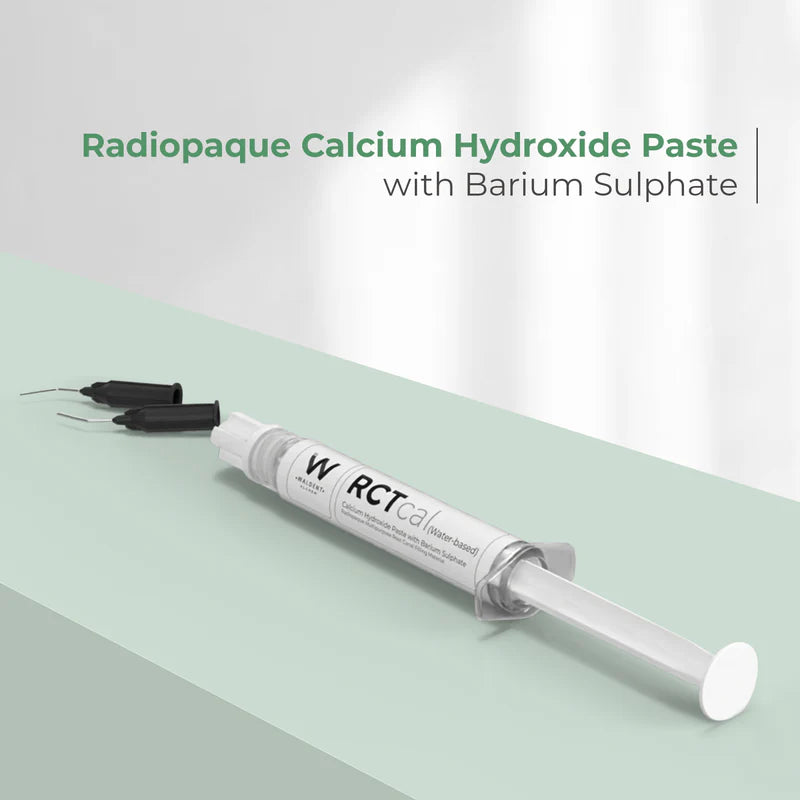 Waldent RCTcal is a radiopaque calcium hydroxide paste with barium sulphate with basic pH of value >12.5 and is indicated for endodontic dressing procedures as root canal filling material.